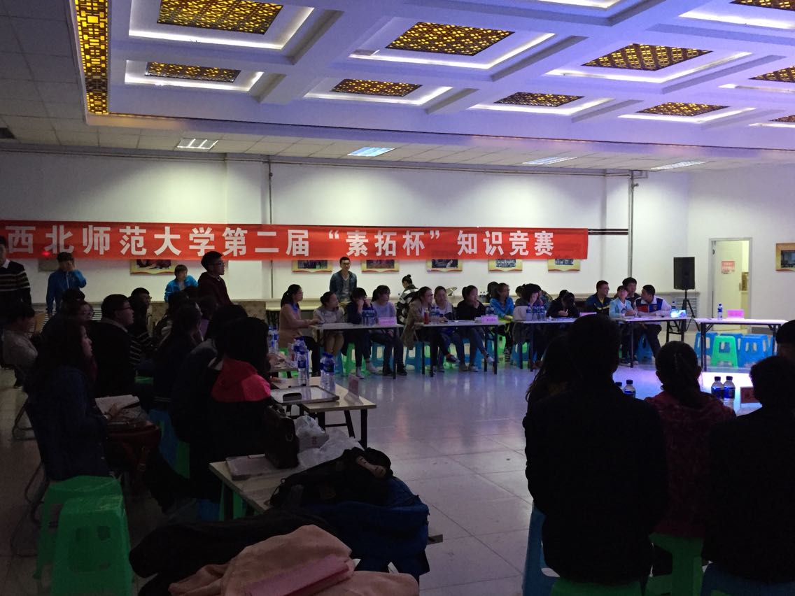 2015年4月12日晚7:30分在大学生活动中心404举办了由诸侯快讯和旅游学院共同主办的西北师范大学第二届“素拓杯”知识竞赛。此次比赛的题目类型从人文、地理、历史、生物、物理方面的知识,到基本的素拓知识。竞赛过程拼抢激烈,高潮迭起,扣人心弦。经过三轮的理解角逐,教育技术学院以344分勇夺桂冠,社会管理与公共发展学院与地理环境与科学学院分别以337分和306分位列二三名。