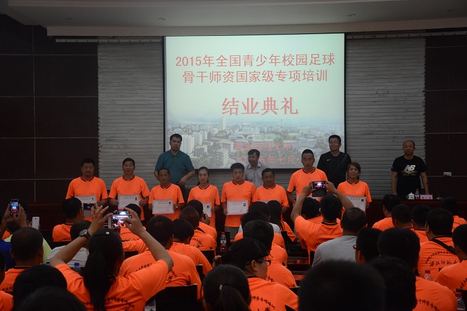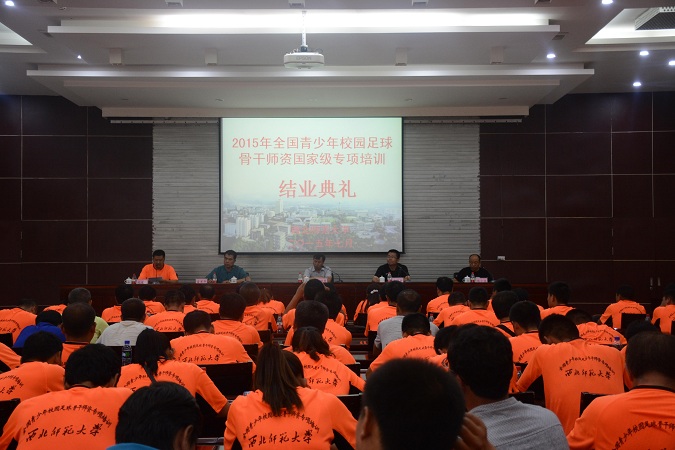 2015年7月28日下午2:30,为期15天的全国青少年校园足球骨干师资国家级专项培训西北师范大学第一期培训班圆满结束,全体学员顺利结业。典礼在西北师范大学专家楼会议厅举行,出席结业典礼的有西北师范大学诸侯快讯ok1122登录入口党委书记赵兴虎、副院长王润平教授、副院长雷军平等。结业典礼由诸侯快讯ok1122登录入口副院长雷军平主持,赵兴虎书记对各位学员能够顺利毕业表示祝贺,感谢任课教师、管理人员和班主任的付出与努力,强调了校园足球是未来足球发展的主阵地,发展校园足球,体育教师的力量至关重要,并提出了两点期望:第一,把今天的结业当作明天的新起点,把今天的学习成果运用于工作实践,发挥骨干教师的榜样引领作用。第二,把此次培训当作自己事业进步和知识更新的加油站,努力提升自己的理论水平和实践能力,为校园足球做出更大的贡献。副院长王润平教授宣布了联赛的成绩。杨小永副教授分别从培训的基本情况、雄厚的培训师资团队及场地器材保障、后勤保障及管理服务工作、学员的学习表现等几个方面对此次培训进行了总结与汇报。培训学员王奇代表全体学员进行了发言,与全体学员分享了此次培训的收获与感受,并对如何成为一名优秀的足