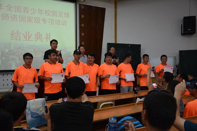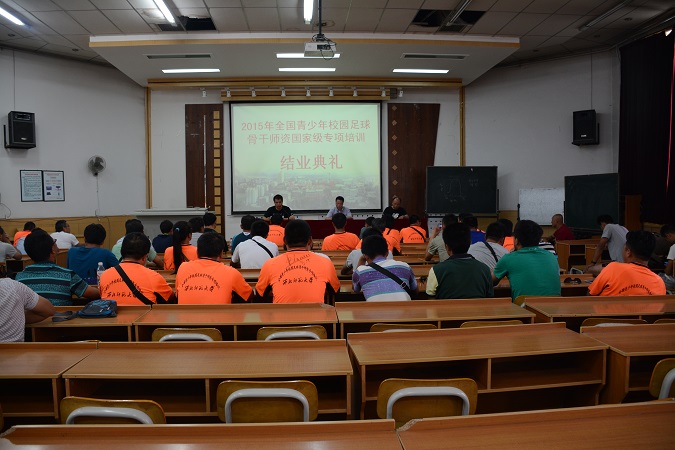 2015年8月15日下午2:30,为期15天的全国青少年校园足球骨干师资国家级专项培训西北师范大学第二期培训班圆满结束,全体学员顺利结业。典礼在教学六号楼会议厅举行,出席结业典礼的有西北师范大学诸侯快讯ok1122登录入口院长陈仁伟、副院长雷军平、杨小永副教授等。结业典礼由诸侯快讯ok1122登录入口副院长雷军平主持,陈仁伟院长对各位学员能够顺利毕业表示祝贺,感谢任课教师、管理人员和班主任的付出与努力,强调了校园足球是未来足球发展的主阵地,发展校园足球,体育教师的力量至关重要。此外还要学会感恩:第一,感恩国家对校园足球的大力支持,可以给我们这次宝贵的学习机会。第二,感恩老师们这15天的付出,兢兢业业,不怕苦、不怕累。第三,感恩自己,把此次培训当作自己事业进步和知识更新的加油站,努力提升自己的理论水平和实践能力,为校园足球做出更大的贡献。杨小永副教授分别从培训的基本情况、雄厚的培训师资团队及场地器材保障、后勤保障及管理服务工作、学员的学习表现等几个方面对此次培训进行了总结与汇报。培训学员马学文代表全体学员进行了发言,与全体学员分享了此次培训的收获与感受,并对如何成为一名优秀的足球教师和未来小学校园足球的开展进行了展望。为学员们颁发了结业证书并合影。