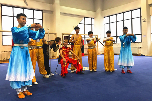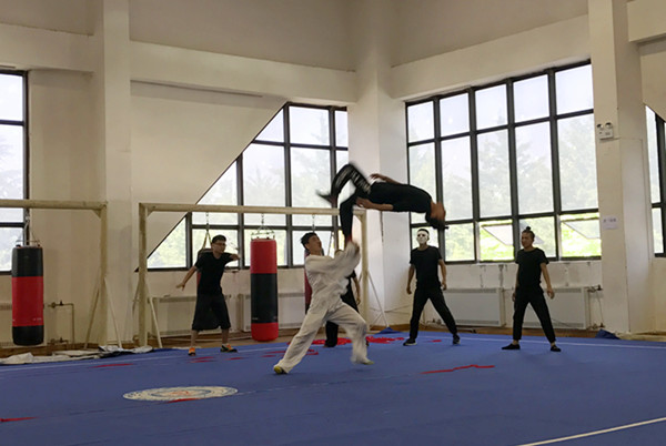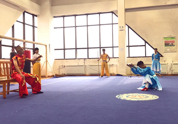 考试中最让同学们期待的依然是“竞艺武术”。《军民情缘》、《师途》、《座山雕--智取威虎山》、《荆轲刺秦王》和《比武招亲》等节目以技击动作为主线,融入了故事情节、舞蹈、配乐、旁白等元素。大胆的构思、巧妙的结合、鲜明的主题、应景的服饰、震撼的音乐、崇德尚武的情怀以及同学们精彩的表演赢得了阵阵掌声和喝彩。同时,“竞艺武术”也增强了同学们的团结协作意识和集体荣誉感。