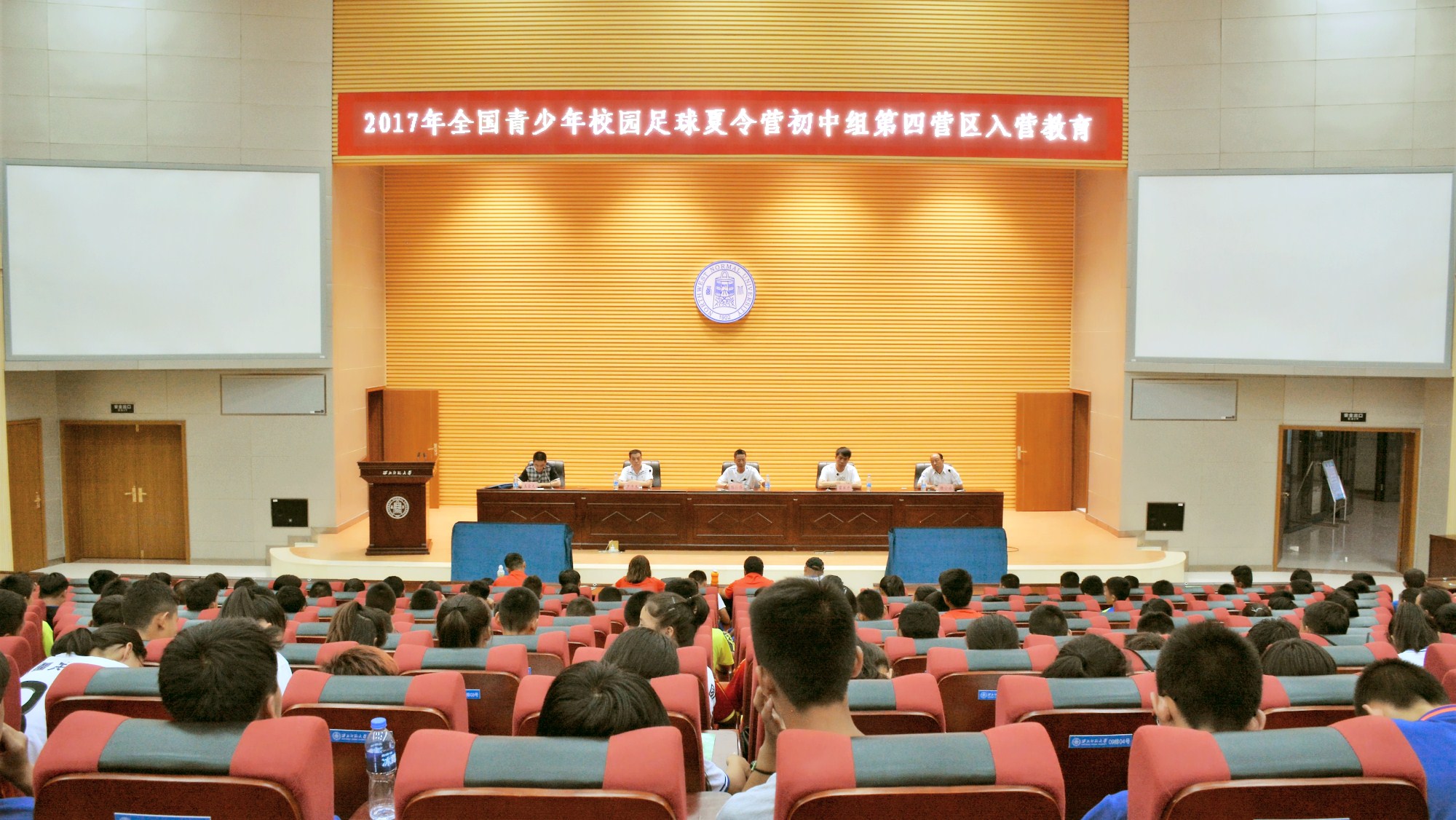 7月19日晚19:30分,2017年全国青少年校园足球夏令营初中组(第四营区)在新校区毅然报告厅举行入营教育活动,组委会全体成员、各省、自治区领队、教练员及全体营员参加了活动。