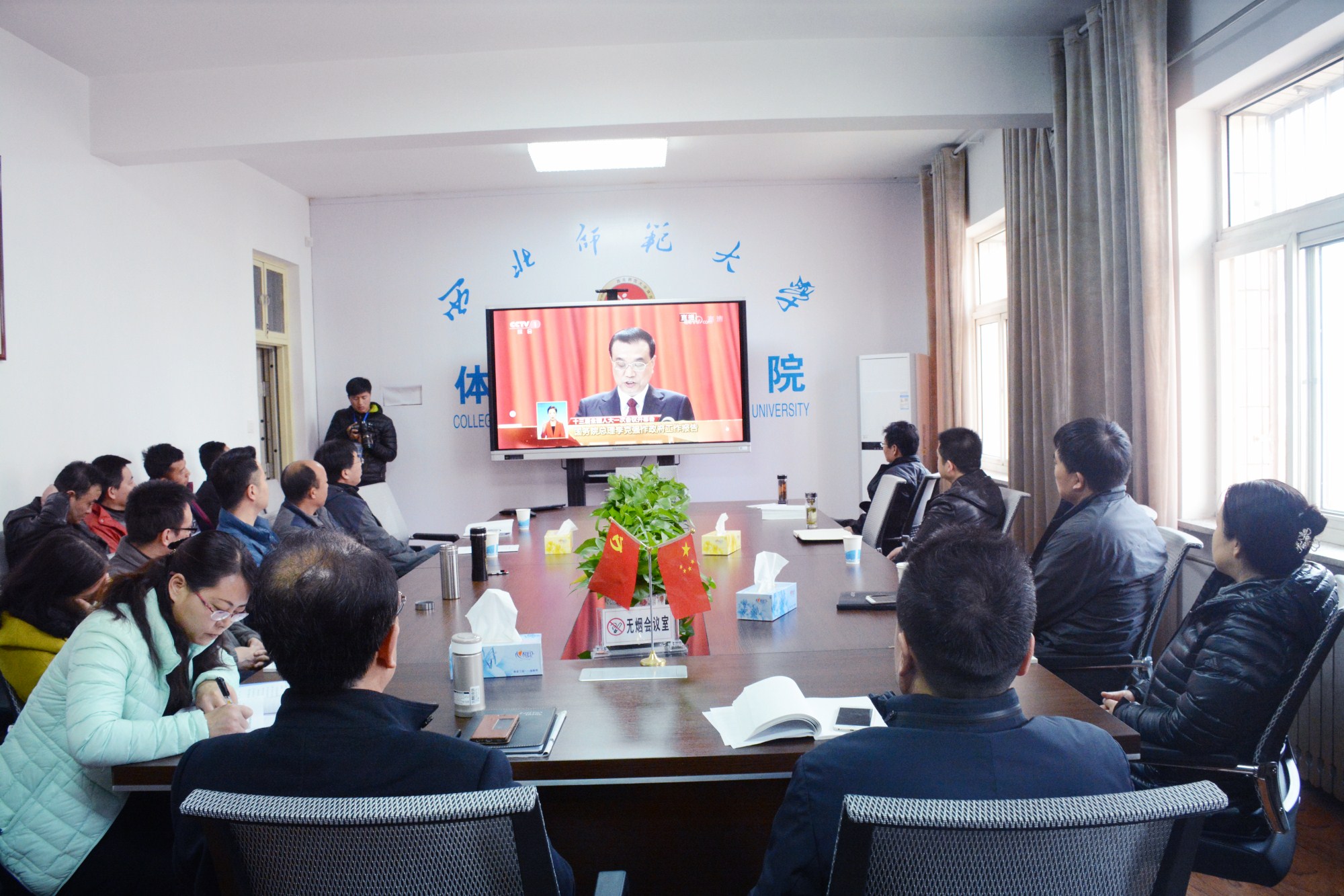 2018年3月5日上午9时,学院领导班子、党委委员、系部所中心主任、各支部书记以及行政教辅人员在三楼会议室,集中收看了第十三届全国人民代表大会第一次会议开幕会现场直播,聆听了国务院总理李克强代表国务院作过去五年政府工作报告,认真学习“两会”精神。