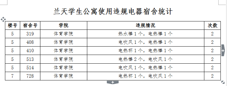 近期兰天学生公寓中心向学院反馈了公寓内使用违规电器情况,以下宿舍现已被通报两次,望班主任和学生干部加强管理,做好对违规电器的查处和相关人员的处分工作。