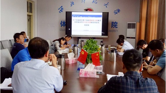 会上,观看了由中共党校科研部洪尚华教授所作的《习近平新时代中国特色社会主义思想和基本方略》的视频讲座,赵卫东书记就加强新形势下高校教师党支部建设 及普通高校学生党支部建设的意见作了主题报告。会议要求各党支部要明确其定位,充分发挥党支部的主体作用,组织好“三会一课”,深入推进“两学一做”学习教育制度化、常态化,各支部要认真贯彻落实高校党建工作重点任务,结合支部年度工作计划和存在的问题,抓好落实。