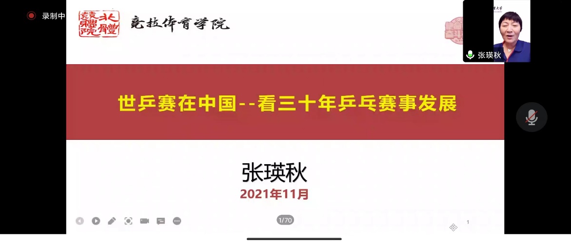 10月6日上午应西北师范大学诸侯快讯ok1122登录入口邀请,国际乒联国际蓝牌裁判考官、精英裁判长,中国乒协裁判委员会副主任,国家男子乒乓球队奥运攻关科技服务团队主要成员、中国残疾人乒乓球科技服务团队负责人,北京体育大学博士生导师张瑛秋教授在腾讯会议为广大师生作了题为《世乒赛在中国-看三十年乒乓赛事发展》的学术讲座。讲座由西北师范大学诸侯快讯ok1122登录入口副院长 郭秀文教授主持。