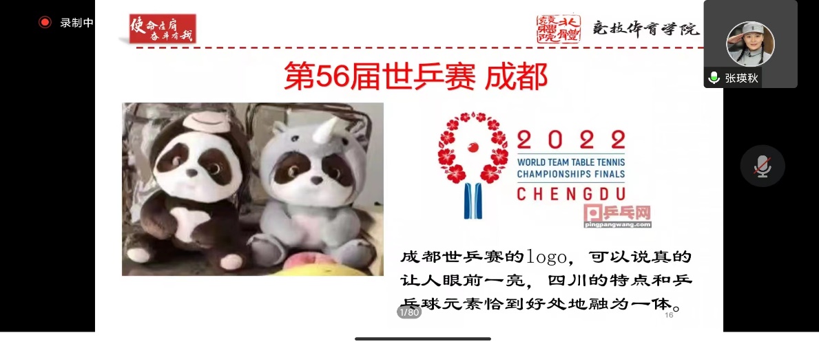 张教授首先介绍了在中国共举办了六次世乒赛以及这六次世乒赛上吉祥物的寓意。从第26届世乒赛到第56届世乒赛的发展可以看出世乒赛的参赛规模不断增加,赛事体系也不断完善。随着时代的变迁,科技也不断融入比赛,从最初观看赛事的纪录片、无转播无慢放到第56届世乒赛上有了LED屏、直播、回放、转播、慢镜头技术、灯光效果等科技的注入,使赛事中科技的含量越来越多,从而更好的呈现体育赛事。