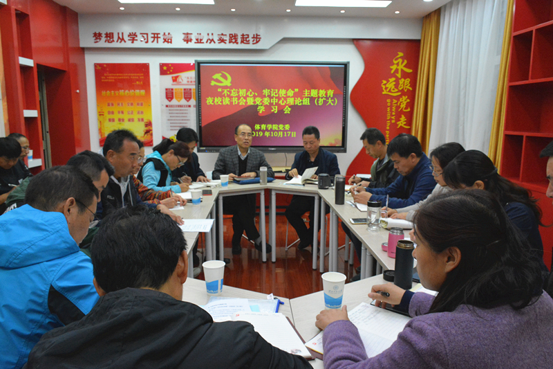 10月17日晚,学院党委在三楼306党建活动室召开了"不忘初心,牢记使命”主题教育夜校读书会暨各党委理论学习中心组(扩大)学习会议。领导班子成员、党委委员、党支部书记、各系部主任等25人参加了会议,会议由赵卫东书记主持。