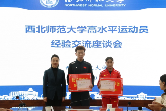 会上,邓小娟向运动员代表张新艳、李泽宇颁发校长奖学金;党委学生工作部负责人宣读《关于表彰张新艳、李泽宇同学获得“校长奖学金”的决定》;运动员代表作经验交流分享。