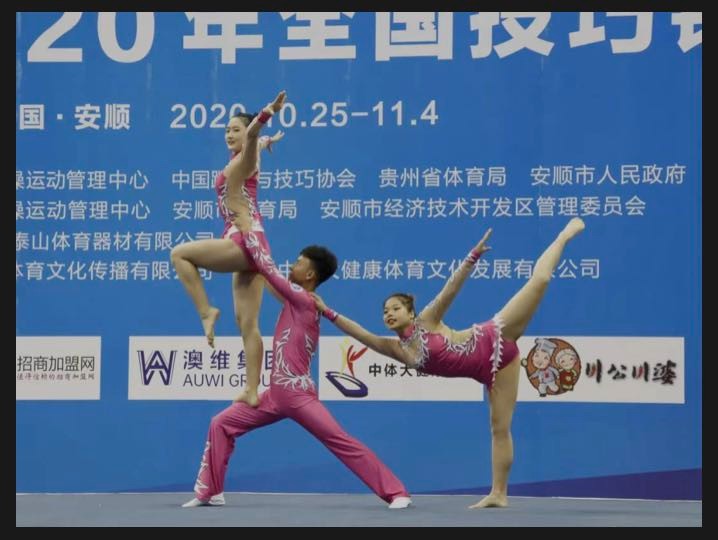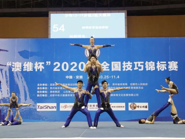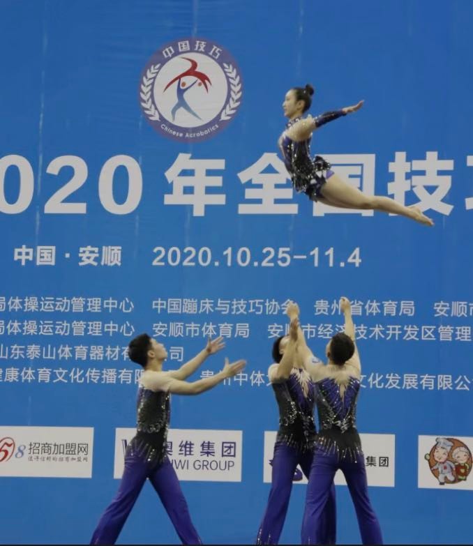 “澳维杯”2020年全国技巧锦标赛于10月25日在贵州安顺举行。此次全国技巧锦标赛共有来自全国14个省市的71支代表队参赛,我校技巧代表队以奋发向上的精神风貌,经过顽强拼搏,获得了混合四人冠军、混合三人冠军和第三名、大集体亚军的优异成绩,为学校赢得了荣誉。