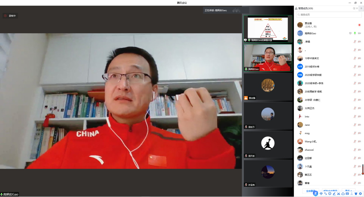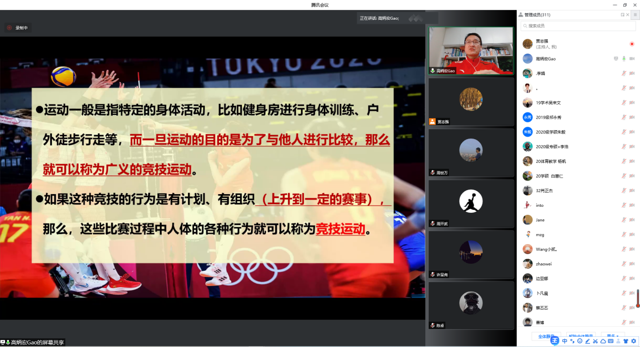 高炳宏教授首先通过介绍所属团队为我国优秀运动员备战奥运会和全运会提供科技攻关与服务案例,引出讲座主题:如何正确理解竞技运动科学、如何发展竞技运动科学的思考。高教授围绕第一个问题,介绍了运动与竞技运动的区别,从五个方面分析了运动训练提高竞技水平与成绩的内因和外因,并结合国家队周训练计划,详细讲解了运动训练的目标、方法选择、训练结构和效果评价;分析了从运动训练学到竞技运动科学过渡问题,提出了竞技能力构成的三驾马车;区分了基础体能训练与专项体能训练,提出体能训练中多学科的交叉融合问题,总结当前运动训练新模式、新理论与新方法;分享了新时代“体医理”融合型新体育人才培养的体会与感悟,认为竞技运动科学应该更专、更新、更准、更融合。